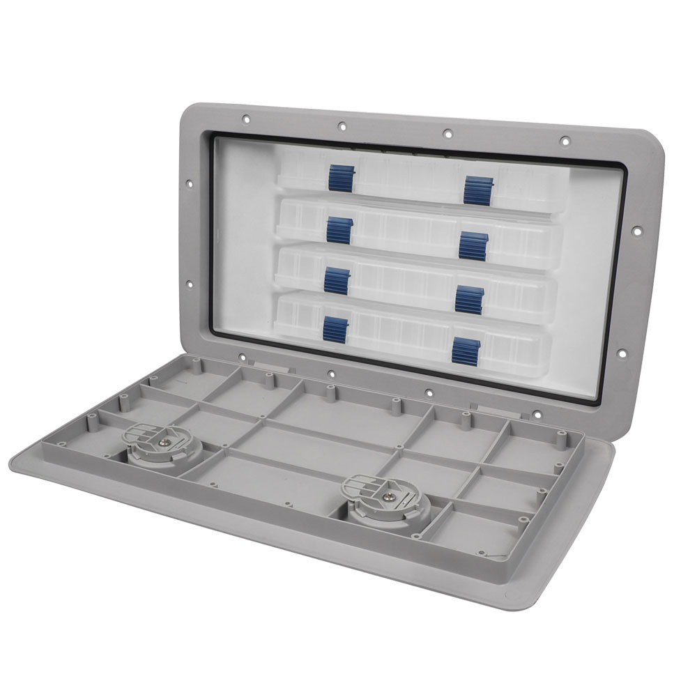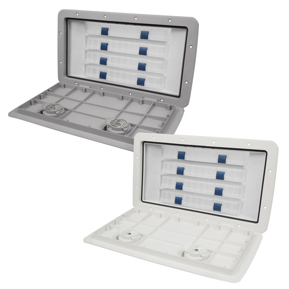 Inbouwkast voor de boot met 4 kunstaasdozen - Tempress Cam Tackle 44580/44583. De Cam Tackle van Tempress bestaat uit verschillende componenten: 1 inzet, 4 kunstaasdozen en een vloerluik. De inbouwkast is verkrijgbaar in wit en donkergrijs. Door het gebruik van UV-bestendig, met glasvezel versterkt polypropyleen (kunststof) met een gestructureerd oppervlak aan het onderste luik, kan de inbouwkast overal in de boot worden geïnstalleerd. Het vloerluik of de inbouwdooskast is ook bestand tegen grotere belastingen.