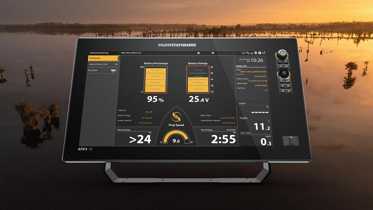 Kijk en leer, zie in realtime vermogenswaarden, waarschuwingen over een bijna lege batterij en de resterende gebruiksduur op uw Humminbird® visvinder.