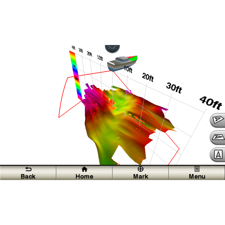 Met deze weergave kunt u vis zoeken terwijl uw boot vaart. De hele waterkolom die u bent gepasseerd wordt weergegeven in 3D, vanaf de bodem tot het oppervlak, met alle vissen daar tussenin.