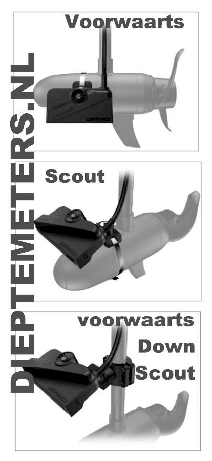 - Drie weergaven met één transducer: Forward weergave vóór uw boot, Down weergave onder uw boot of Scout weergave – een ultrabreed bovenaanzicht vóór uw boot
